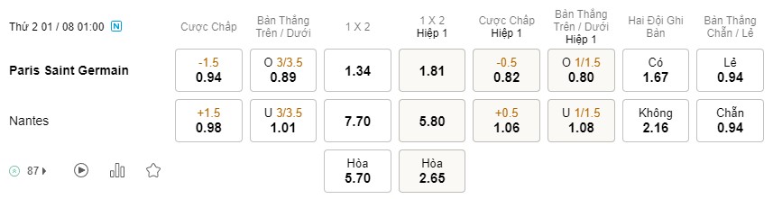 Trong khi đó nhìn đối thủ của PSG, Nantes dù giành được 2 chiến thắng trong 5 trận đấu đã qua, tuy nhiên gần nhất, họ đã phải nhận một thất bại với cách biệt tối thiểu trước Rennes. Vì vậy các chuyên gia nhận định, lựa chọn PSG trong trận đấu này sẽ là chính xác hơn.